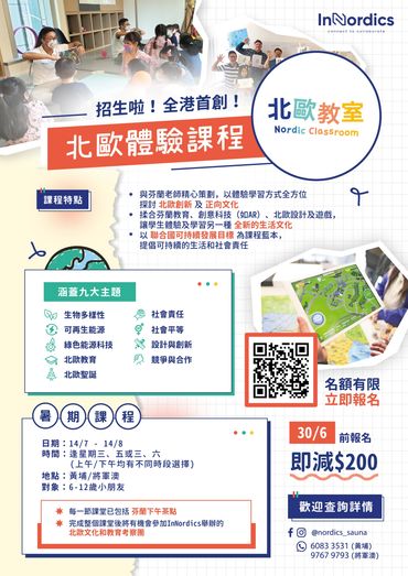 Nordic Classroom is the very first program in Hong Kong introducing Nordic Culture and lifestyle. Based on the 17 Sustainable Development Goals set by The United Nations, InNordics, together with Finnish teacher, developed a program to let students explore and experience the unique culture, lifestyle and understand the values in the Nordic world. Students' global horizon will be broadened by touching the world topics of the Nordic biodiversity, green technology, design, innovation, education and equality.